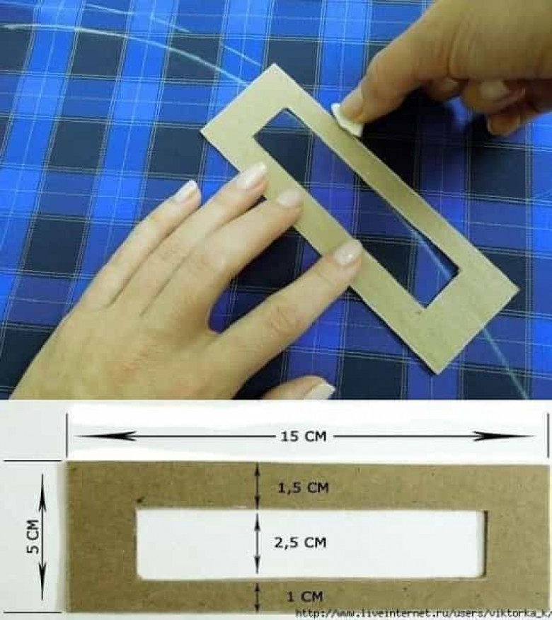 ՖՈՏՈ1. Պատրաստի՛ր այսպիսի շաբլոններ և միաժամանակ նշիր ոչ միայն կտորը նախատեսված տեղից կտրելու գիծը, այլ նաև հետագայում դրվելիք կարի գիծը՝