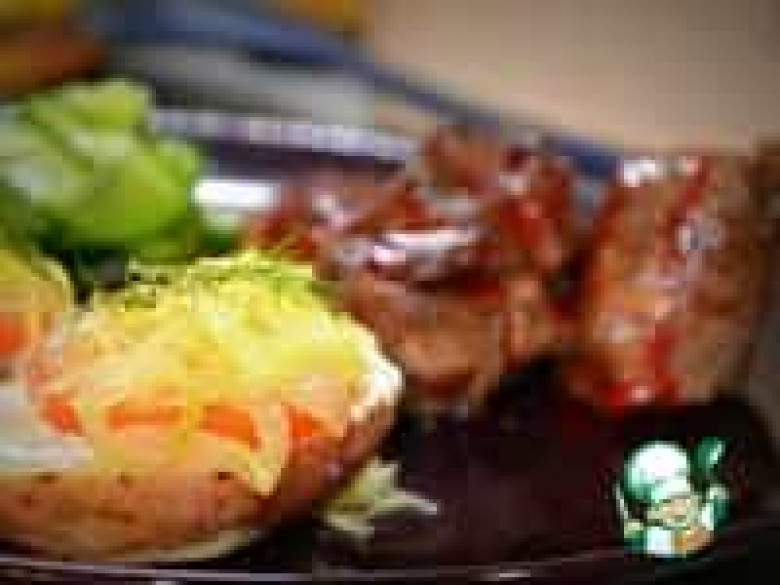 Կարտոֆիլը կիսել, համեմել պղպեղով, վրան քսել թթվասեր, դնել կտրատած լոլիկ ու տապակած սոխ։