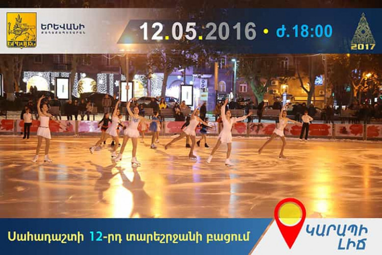 դեկտեմբերի 5-ին` ժամը 18:00-ին, հրավիրում ենք Կարապի լճի հարակից տարածք՝ ներկա գտնվելու սահադաշտի 12-րդ տարեշրջանի հանդիսավոր բացմանը, որի ընթացքում ցուցադրական ելույթներով հանդես կգան Երևանի Իրինա Ռոդնինայի գեղասահքի դպրոցի սաները: