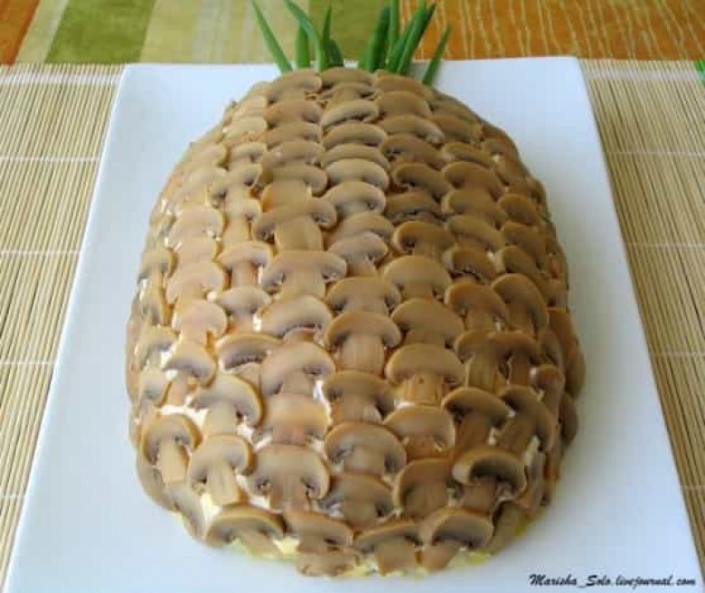 Ափսեի մեջ արքայախնձորի ձևով դասավորել հետևյալ շերտերը և յուրաքանչյուր շերտը մայոնեզով խառնել: Գազար, խոզապուխտ, եգիպտացորեն, ձու, իսկ վերևի շետում միայն սունկը դասավորել առանց մայոնեզով խառնելու, կանաչ սոխից արքայանխնձորի տերևիկների նման ձև ստանալ: