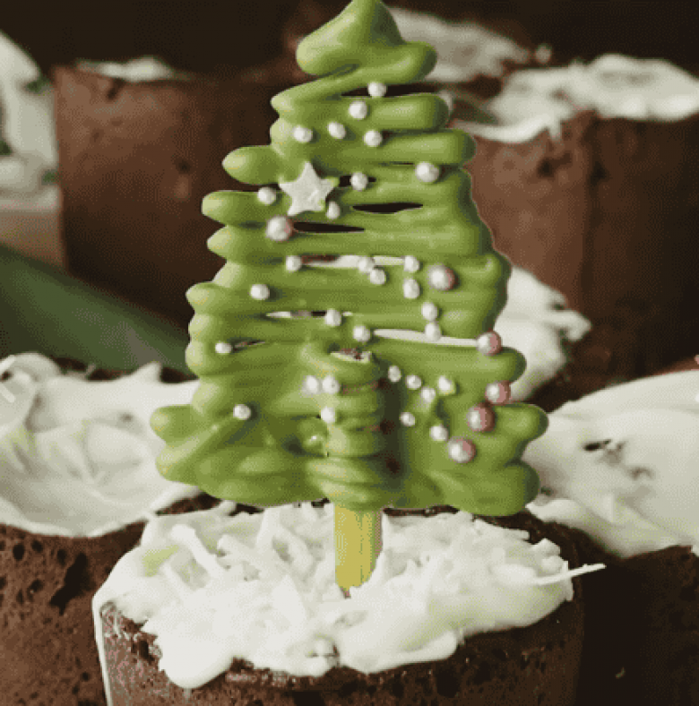 Ձողիկների վրա լցնել կանաչ շոկոլադը եղևնու տեսքով, սառեցնել։