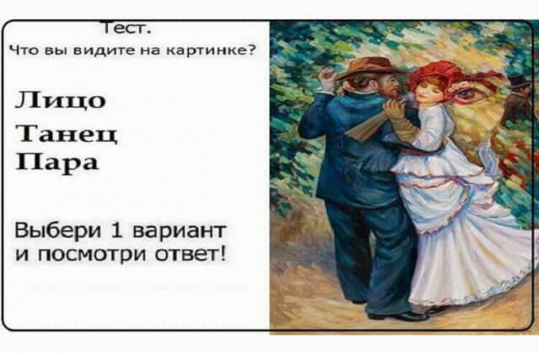 Նայեք լուսանկարին և ֆիքսեք, թե ինչ եք տեսնում առաջինը լուսանկարում։ Բացատրությունը կարող եք գտնել պատասխաններում։ Պար։ Երկար սպասված հաջողության նշան։ Գործերում ձեզ հրաշալի առաջընթաց է սպասվում։
