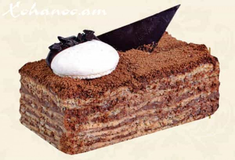 Շերտերը յուղաթղթով դնում ենք իրար վրա և թողնում սառչի։ Առանձին ամանի մեջ մանրացնում ենք շերտերի կտորները և դնում մի կողմ: Վանիլինի տաշեղը բացում ենք և մաքրում սերմերից։ 1 բաժակ սառը կաթի մեջ խառնում ենք ձվի դեղնուցն ու օսլան մինչև համասեռ զանգված ստացվի։ Թույլ կրակի վրա եռացնում ենք սերուցքը վանիլինի սերմերի և շաքարավազի հետ, մինչև շաքարն ամբողջությամբ լուծվի։ Անընդհատ խառնելով եռացող սերուցքի մեջ լցնում ենք կաթի և ձվի խառնուրդը և եփում թույլ կրակի վրա մինչև թանձրանա։ Վերցնում ենք կրակից, կրեմը քամում ենք և սառեցնում։ Կրեմի մեջ ենք լցնում կտրատած շոկոլադը և խառնում մինչև համասեռ դառնա։ Ավելացնում ենք մանրացված ընկույզն ու հարում այնքան մինչև համասեռ և թանձր զանգված ստանանք։ Այնուհետև լցնում հերմետիկ ամանի մեջ և սառեցնում։ Առանձնացում ենք 5 ճաշի գդալ կրեմ կողքերին քսելու համար։ Պատրաստի շերտերն առատորեն պատում ենք կրեմով և դնում մեկը մյուսի վրա։ Ապա առանձնացված կրեմով պատում ենք տորթի կողքերը և վերին շերտը: