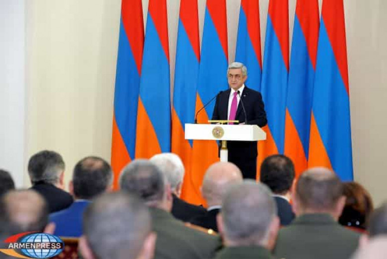 Շնորհավորելով հայ ժողովրդին հայկական բանակի օրվա կապակցությամբ ՀՀ նախագահն ընդգծեց, որ հայկական բանակը ստեղծվել է պետականության վերականգմանը զուգընթաց: «Սակայն բանակի կազմավորումը սկսվել է ավելի վաղ: Այն սկսվել է ոչ թե վերևից, այլ ներքևից` ինքնաբուխ ձևով և ժողովրդի ինքնապաշտպանական բնազդով: Սումգայիթում, Բաքվում և Ադրբեջանի այլ բնակավայրերում ծավալված դաժան իրադարձությունները վերադարձրեցին մեր պատմական հիշողությունը` կոտորածների և գաղթի ճանապարհների սահմռկեցուցիչ տեսարաններով: Տարերայնորեն ձևավորվող, բայց խորապես գիտակցվա ծ կամավորական շարժումը և կամավորների առաջին ջոկատները դարձան այն պարիսպը, որի վրա պիտի բարձրանար հայկական մի բռունցք` հայկական բանակը: Մենք` որպես ազգ համախմբվեցինք: Այդպես վերջին անգամ համախմբվել էինք Սարդարապատում: Մեզ չվախեցրին հակառակորդի գերազանցող ռեսուրսները, ավելին` այդ հանգամանքը մեզ ստիպեց լրջանալ, հավաքվել և կենտրոնանալ: Մեր բանակը ձևավորվեց կռվի դաշտում, իսկ թշնամու դեմ պատերազմը վարում էինք բառիս բունս իմաստով մեր տան մեջ: Հիշեմ մի եղելություն: Մարդը կռվում է զենքը ձեռքին իր տան պատերից ներս: Պատշգամբից նահանջում է խոհան ոց, ապա կռվելով, նահանջում է հյուրասենյակ, հետո նորից հետ է գրավում ազատագրում է իր խոհանոցն ու պատշգամբը: Սա փոխաբերություն չէ, սա կոնկրետ օրինակ է Քարինտակի հերոսամարտից»,- նշեց Սերժ Սարգսյանը: