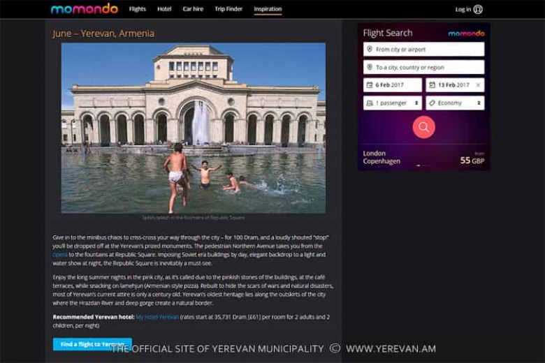 «Momondo» բրիտանական միջազգային որոնողական համակարգը ճանաչել է Երևանը որպես 2017թ. զբոսաշրջային մատչելի քաղաք