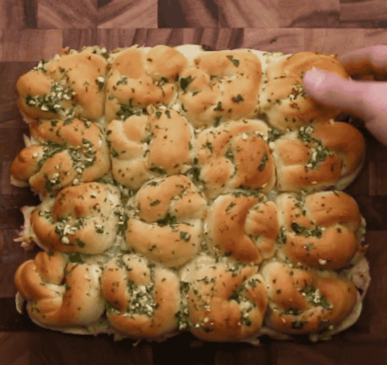 Խմորը մի քանի մասի բաժանել, քարկապ գցել, շարել իրար կողք, թխել ջեռոցում, մեջտեղից կիսել, ավելացնել միսը, պեստոն, պանիրը:
