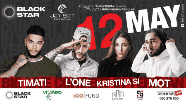ՀԱՍԱՐԱԿՈՒԹՅՈՒՆՄայիսի 12-ին Կարեն Դեմիրճյանի անվան մարզահամերգային համալիրում տեղի է ունենալու Black Star-ի անդամների երկրորդ համերգը Հայաստանում: Այս անգամ մենք կվայելենք ոչ թե երկու, այլ չորս երգիչների ելույթները: Timati-ին և L’One-ին միանալու են Мот-ը և Кристина Си-ն: