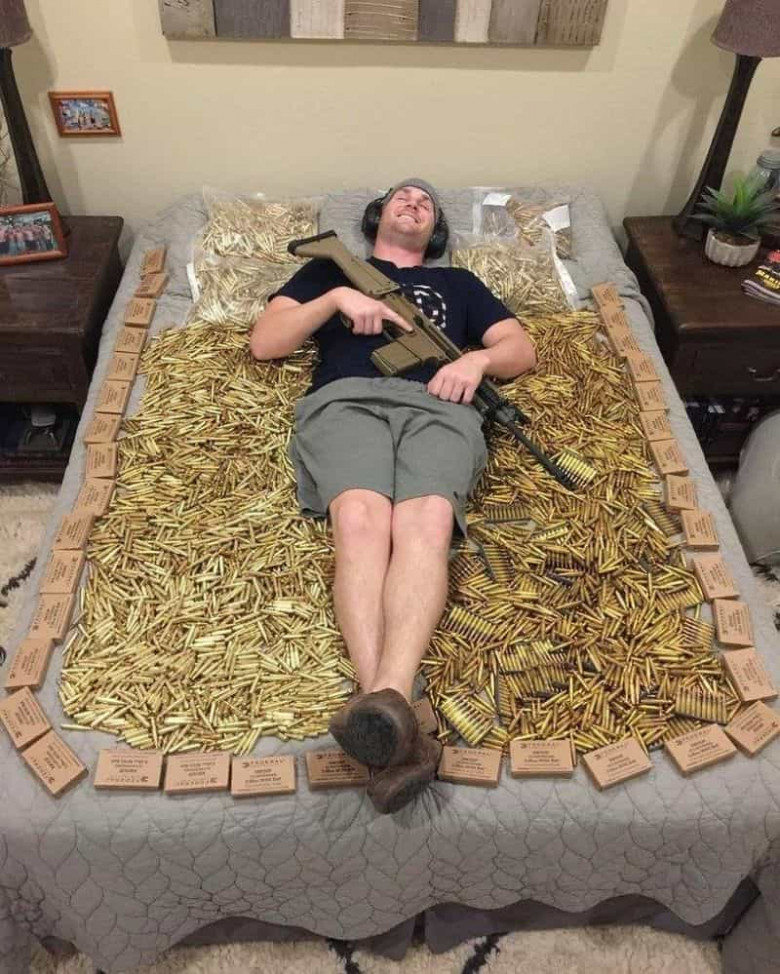 ՖՈՏՈКак проходит обычный день техасца: позавтракать патронами, принять ванну с патронами, подремать на застеленной патронами кровати в окружении оружия и боеприпасов, и проверить в кладовке, не закончились ли патроны.