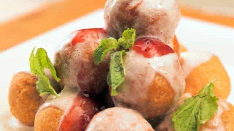 Խմորը մի քանի մասի բաժանել, կենտրոնում լցնել պաղպաղակը, փակել բոլոր կողմերից, դնել սառնարան 1 ժամ:
