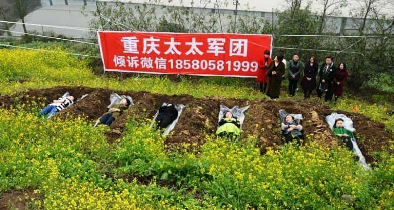 ԼԱՅՖԱռաջին հայացքից խմբակային թաղում հիշեցնող այս լուսանկարներն իրականում գերեզմանային մեդիտացիայի ընթացքից արված կադրեր են: Լքված ու բաժանված չինացի կանայք շաբաթը մեկ անգամ պառկում են նմանատիպ փոսերի մեջ, այդպիսով «թաղելով» իրենց հին կյանքն ու նախկին դժվարությունները: