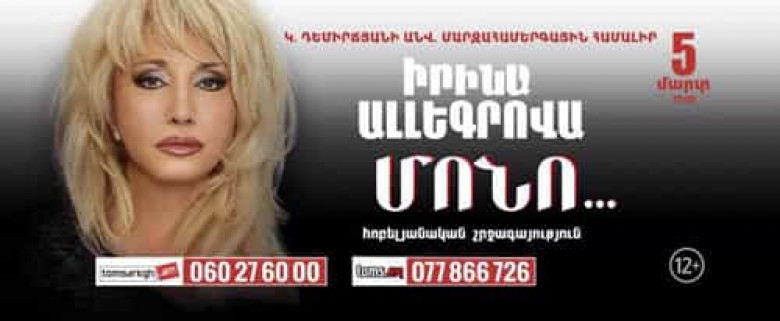 ՀԱՍԱՐԱԿՈՒԹՅՈՒՆԱնցած շաբաթ հայտնի դարձավ, որ Իրինա Ալեգրովայի՝ մարտի 5-ին նախատեսված համերգը չեղարկվել է, վաճառված տոմսերն էլ վերադարձվելու են։