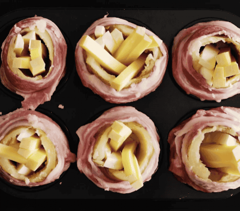 Կարտոֆիլը խաշել, փաթաթել բեկոնով, միջուկը հանել, մեջը դնել սխտոր, պանիր, դնել ջեռոց.