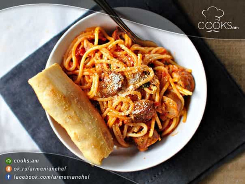 - Նրբերշիկները տապակում ենք և լցնում սպագետտիյի վրա։