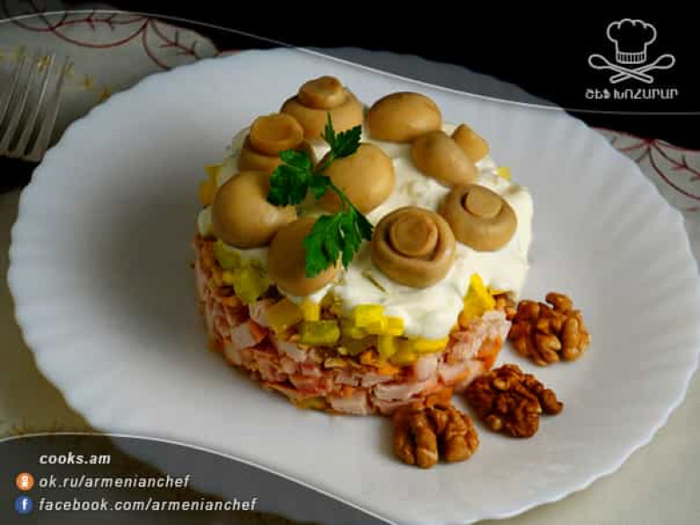 Այժմ պատրաստում ենք սունկը: Շամպինյոնները կտրատում ենք և տապակում բուսական յուղով, ավելացնում ենք մանր կտրատած սոխ: Շամպինյոնների վրա ըստ ճաշակի աղ և սև պղպեղ ենք ավելացնում: Թողնում ենք սառչի: