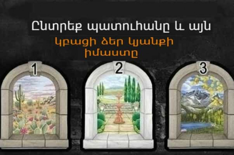 Marketium-ը գրում է, որ պատուհաններով թեստը կօգնի հասկանալ, թե ինչ կա ձեր հոգում։ Ընտրեք դրանցից մեկն ու պարզեք, թե ինչ է ձեզ ապագայում սպասվում։ 5 վայրկյանից ավելի չմտածեք, պարզապես ընտրեք այն մեկն, որն ավելի շատ եք հավանում։