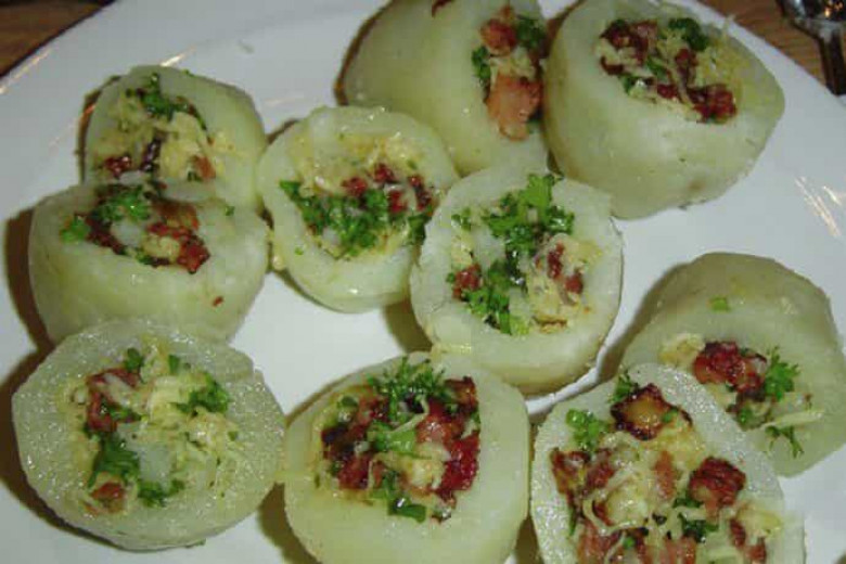 Այնուհետև արդեն կարելի է լվանալ կանաչին և մանրացնել։ Կարտոֆիլը սառեցնելուց հետո պետք է մաքրել, կիսել և զգուշորեն հանել միջուկը՝ լցոնի համար տեղ ազատելով։