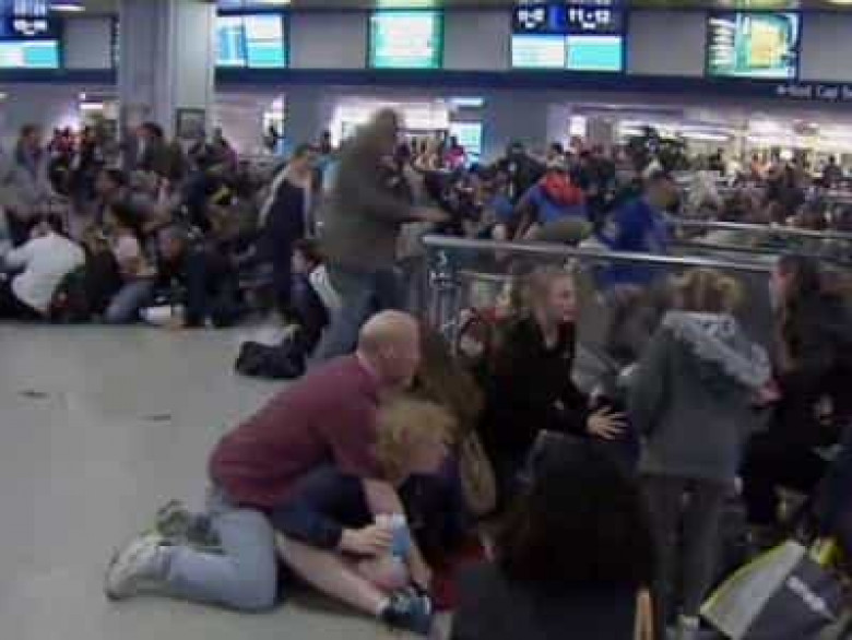 Մարդիկ սկսել են խուճապահար վազել կայարանով եւ թաքստոց որոնել` խոռվարարի դեմ ոստիկանության կողմից էլեկտրաշոկերի կիրառումը կրակոցներ համարելով: Ինչպես նշվում է` մարդիկ թաքնվում էին աղբարկղերի հետեւում մի կողմ նետելով իրենց իրերը: