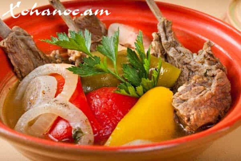 Արգանակը եռալուց հետո թողնում ենք միսը թեթևակի կարմրի։ Եթե խոզի մսով ենք պատրաստում, ապա բուսայուղի կարիք չկա։ Իսկ տավարի և գառան մսի դեպքում մի քիչ բուսայուղ ենք ավելացնում և կաթսան կրակից վերցնում։ Սոխը կիսաշրջաններով կտրում ենք և լցնում մսի վրա։