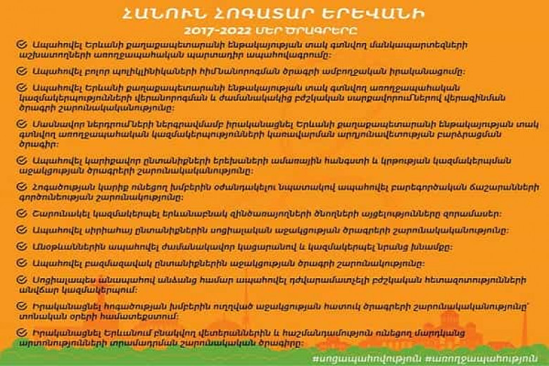 Հանուն հոգատար Երևանի ծրագրերին ու արդեն ունեցած համատեղ ձեռբերումներին կարող եք ավելի մանրամասն ծանոթանալ նախընտրական ծրագրի այդ բաժնում: