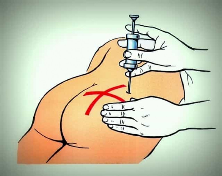 2. Ներարկման տեղը ճիշտ որոշելու համար հետույքով երևակայական խաչ անցկացրու, որը այն 4 մասի կբաժանի: Ներարկումը պետք է անել վերին արտաքին քառակուսու մեջ: