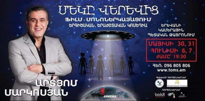 ՀԱՐՑԱԶՐՈՒՅՑՄայիսի 30-ին, 31-ին, հունիսի 6-ին և 7 –ին, ժամը՝ 19.30-ին, դերասան, ռեժիսոր, պրոդյուսեր, սցենարիստ Արտյոմ Մարկոսյանը կներկայանա նոր երգիծական երաժշտական ֆիլմ-մոնոներկայացումով, որը կոչվում է «Մեկը վերևից»: Այն կարող եք դիտել Երևանի պետական կամերային թատրոնում: