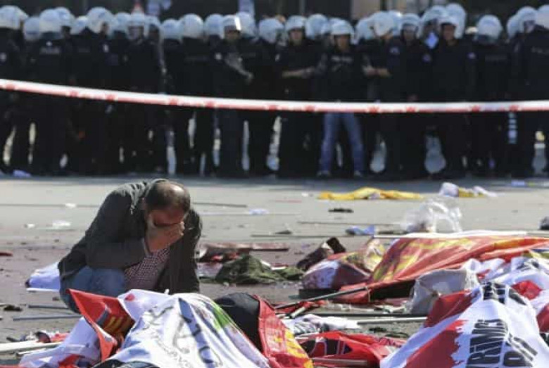 Անկարայում երկաթուղային կայարան տանող կամրջի տակ երկու պայթյունները որոտացել են «Ոչ պատերազմին, խաղաղություն եւ աշխատանք» կարգախոսով արհմիութենական հակառազմական հանրահավաքի մեկնարկից առաջ: