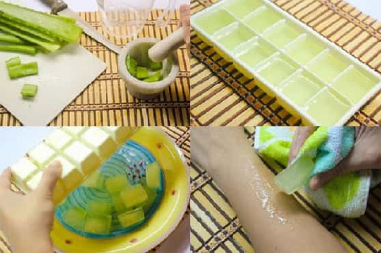 Ալոեի հյութը լցնել սառնարանային տարայի մեջ ու պատրաստել սառցե խորանարդներ։ Ամեն առավոտ մաշկը մարքել այս խորանարդներով։Այն հիանալի անցկացնում է մաշկի բորբոքումները։