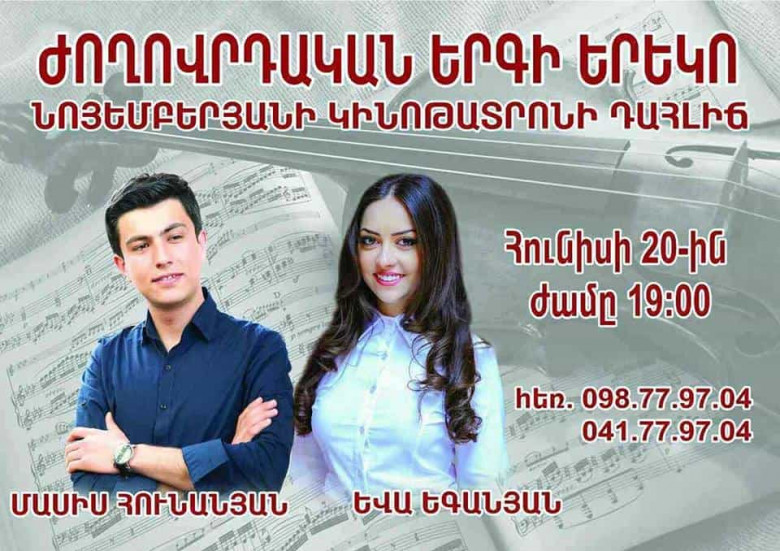 ԼԱՅՖՄեր օրերում հոգևոր հացի պակաս ունենք : Այդ քաղցը լրացնելու , ոգևորություն արթնացնելու և ժողովրդական երգի գոհարները տարածելու համար երիտասարդ երգիչներ Մասիս Հունանյանն ու Եվա Եգանյանը որոշել են մեծ նախագիծ իրականացնել` կապված մարզերում ժող .երգը լայնորեն քարոզելու վերաբերյալ : Թերևս զրուցեցինք Մասիս Հունանյանի հետ , ով մեզ մանրամասներ պատմեց կապված համերգի հետ .