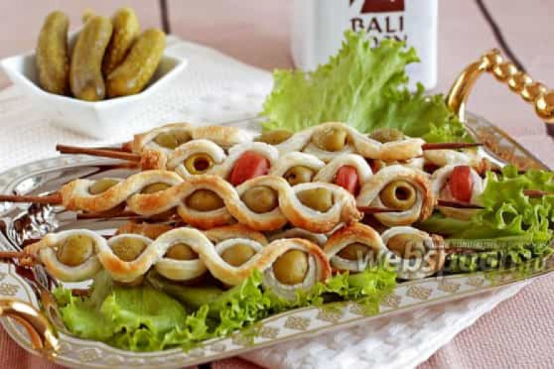 Ձիթապտուղն ու նրբերշիկը հերթով անցկացնել խոհանոցային փայտիկի վրա, փաթաթել խմորը: