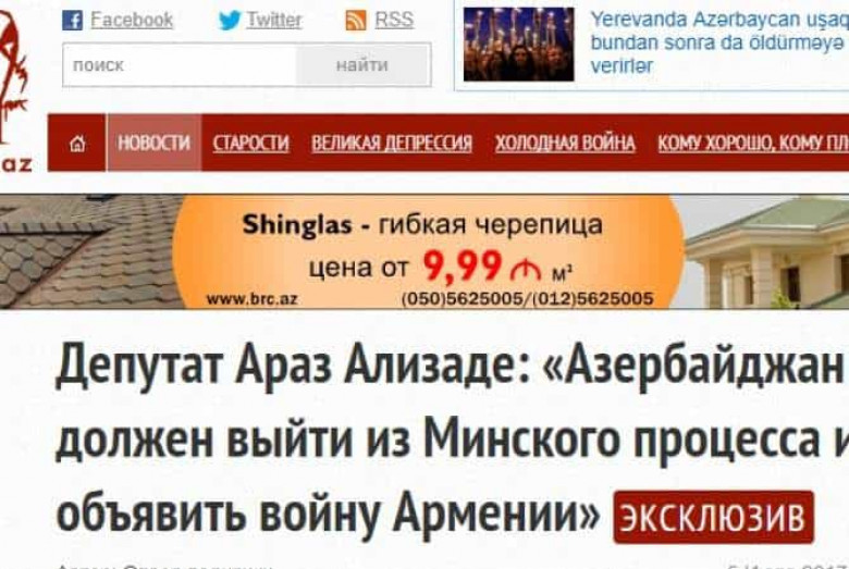 ՄԻՋԱԶԳԱՅԻՆԱդրբեջանի Միլլի Մեջլիսի պատգամավոր Արազ Ալիզադեն խաղաղության դեմ ուղղված հանցագործության կոչ է արել: Ինչպես հաղորդում է «Արմենպրես»-ը, վկայակոչելով ադրբեջանական լրատվամիջոցները, ադրբեջանցի օրենսդիրը կոչ է արել պատերազմ հայտարարել Հայաստանին: «Պետք է հասկանանք մի պարզ ճշմարտություն. ղարաբաղյան հակամարտության խաղաղ կարգավորման գործում ոչ մի առաջընթաց չի լինի: Մենք պետք է սովորենք ապրել, գիտակցելով, որ գտնվում ենք պատերազմի վիճակում»,- ասել է Ալիզադեն՝ հավելելով, որ խնդիրը կարելի է լուծել միայն պատերազմով: