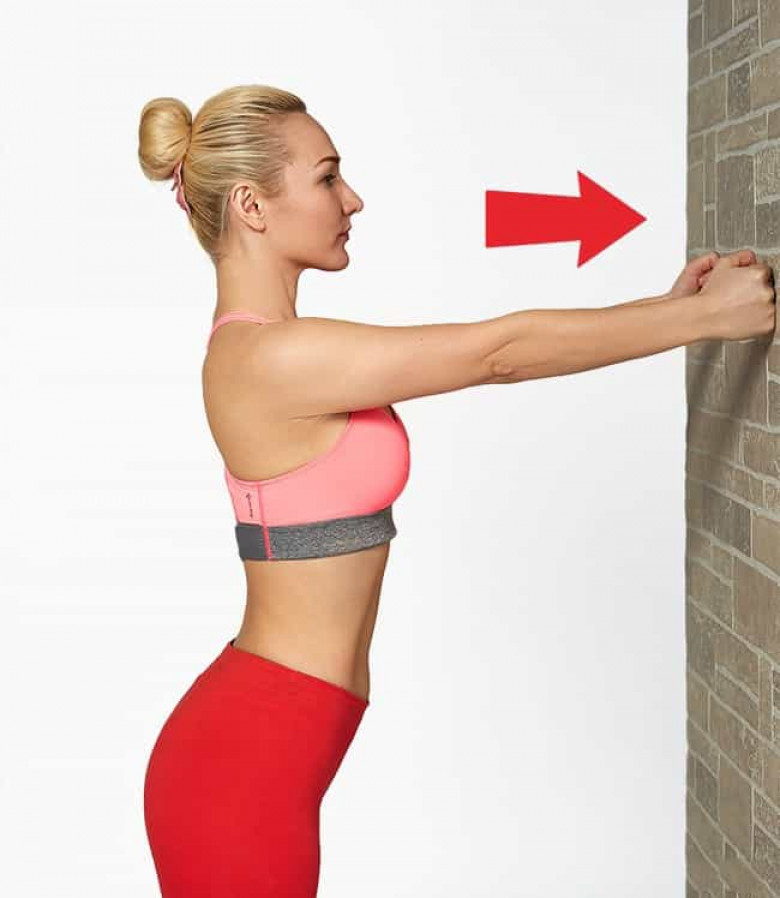 Ուղիղ կանգնեք պատից կես մետր հեռավորության վրա, ձեռքերը ուղղեք դեպի պատը և սկսեք բռունքցներով սեղմել պատը։ Դուք կզգաք, թե ինչպես են ձգվում կրծքավանդակի մկանները։ Պատը սեղմեք 20 վայրկյան շարունակ, որից հետո 10 վարկյան հանգստացեք։ Կրկնեք 3 անգամ։