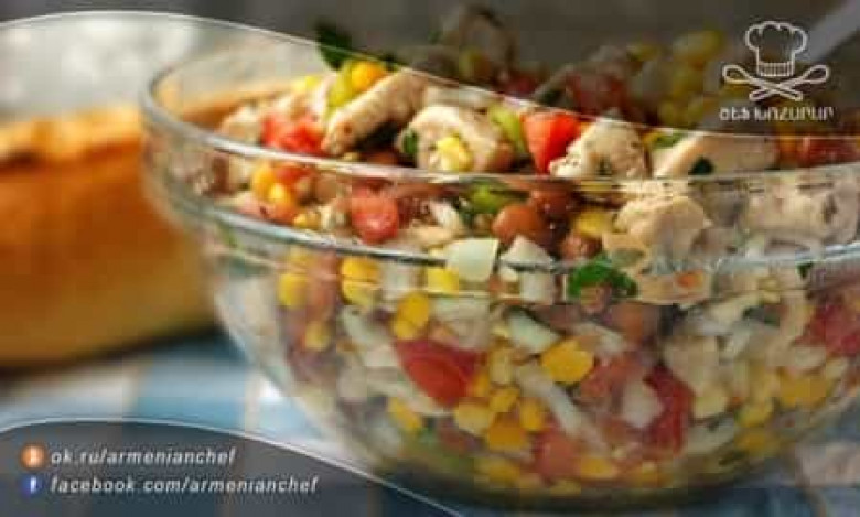 - Հավի կրծքամիսը լվանալ, խորանադիկներով կտրատել, համեմել աղ և պղպեղով, ապա տեղափոխել սառնարան 60 րոպեով, որից հետո տապակել բուսայուղով պատված թավայի մեջ: