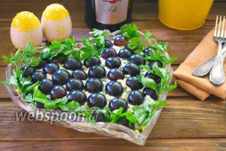 Ավելացնել կանաչիների զնագվածը, մայոնեզ քսել ու շարել խաղողը: