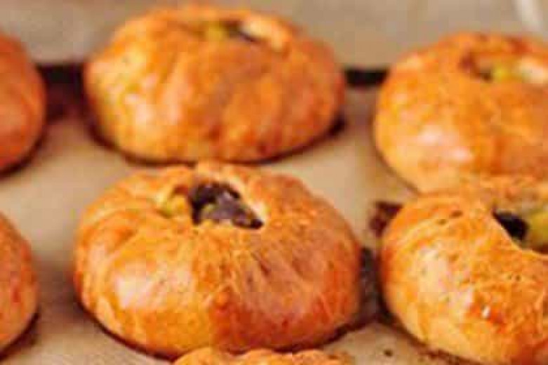 - Բաժանում ենք խմորը երկու հավասար մասի, մի մասը կրկին դնում ենք ցելոֆանի մեջ, մյուս մասը բաժանում ենք 9 գնդի, յուրաքանչյուր գունդ գրտնակում ենք, բացում փոքրիկ լոշիկի պես մեջտեղում դնում ենք մեկ գդալ միջուկ և ամրացնում ենք խմորի ծայրերը խինկալու պես մեջտեղը թողնելով փոքրիկ փոսիկ: