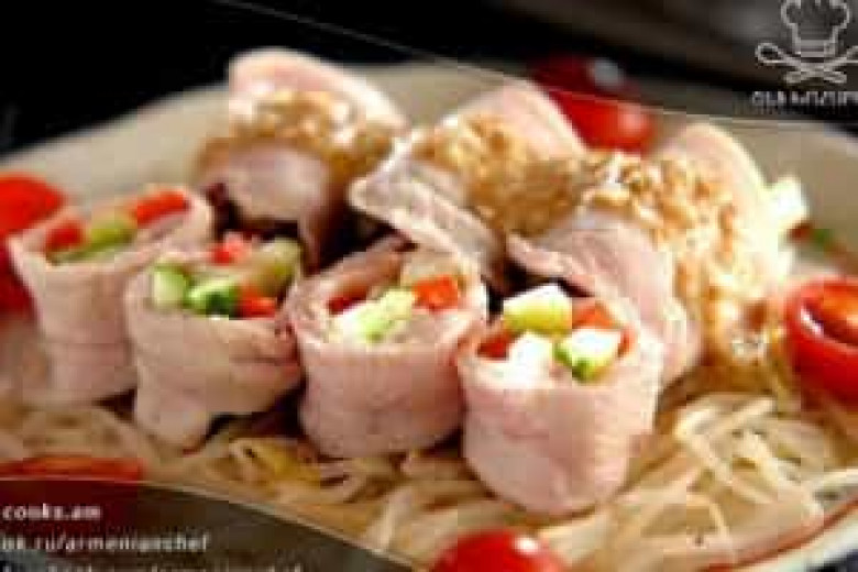 - Ապա փաթաթում ենք կտրատված բանջարեղենը խոզապուխտի շերտերի մեջ ռուլետի ձևով: