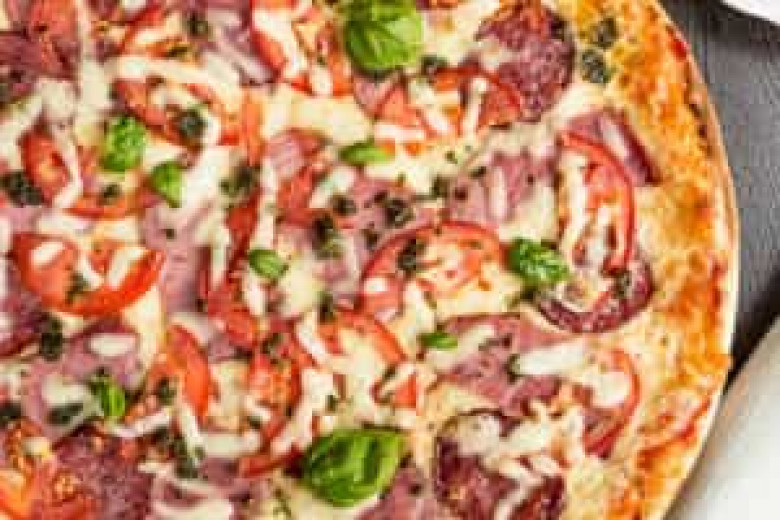 Լոլիկով և խոզապուխտով պատրաստի պիցցան կտրատում ենք և մատուցում որևէ զովացուցիչ հյութի հետ: