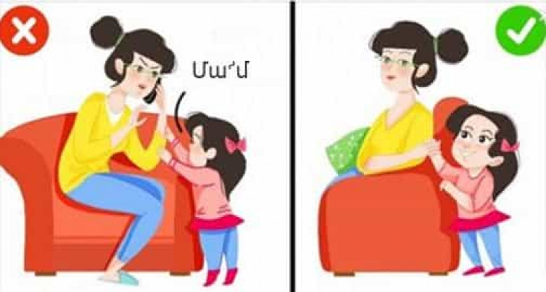 Երբ երեխան ինչ-որ բան է ուզում ասել, իսկ մայրն այդ ընթացքում ուրիշի հետ է խոսում, նա պետք է մոտենա և իր ձեռքը մոր ձեռքի վրա դնի (կամ ուսին): Երբ մայրն իր ձեռը դնի երեխայի ձեռքի վրա, նշանակում է՝ «լսեց» նրան և կաշխատի հնարավորինս շուտ նրան ուշադրություն դարձնել: