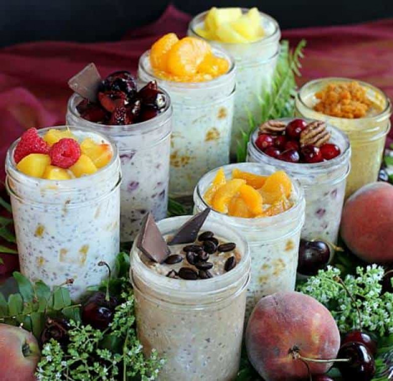 Տարրայի մեջ լցնում ենք վարսակը, կաթը, յոգուրտը, շաքարավազը և մրգերը,