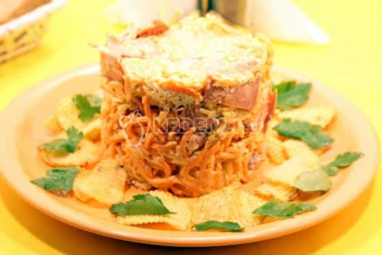 Ապխտած երշիկը կտրատել, այն խառնել կորեական գազարի հետ։ Պանիրը և ձուն քերիչով անցկացնել, այն ավելացնել երշիկի և կորեական գազարի խառնուրդի վրա, ապա ավելացնել չիպսերը և այն խառնել մայոնեզով։