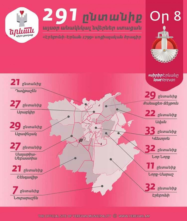 8-րդ օրվա ընթացքում Երևանի քաղաքապետարանի և վարչական շրջանների պատասխանատուներն այցելել են թվով 291 ընտանիք, փոխանցել նրանց Երևանի քաղաքապետի շնորհավորանքը մայրաքաղաքի ծննդյան առթիվ և անակնկալ նվերներ կենցաղային տեխնիկայի տեսքով: