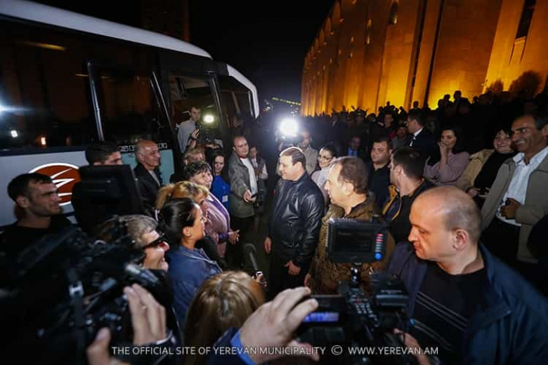 Այնուհետ, մեկնող բոլոր ավտոբուսներին մոտենալուց և զինվորների ծնողներին բարի երթ մաղթելուց հետո, քաղաքապետ Տարոն Մարգարյանը և ՀՀ պաշտպանության նախարար Վիգեն Սարգսյանը, ինչպես և նշել էին նախապես, ընկերակցել են մեկնողներին և հարավարևելյան սահմանամերձ զորամասերից մեկն ուղևորվող ավտոբուսով, ծնողների հետ միասին, մեկնել են զինծառայողների հետ հանդիպման: