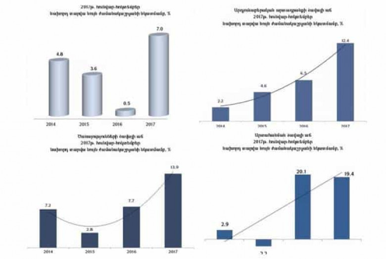 Շինարարության ծավալը նախորդ տարվա նույն ժամանակահատվածի համեմատ նվազել է 0.9 տոկոսով: Էլեկտրաէներգիայի արտադրության ոլորտում 2017 թվականի հունվար-հոկտեմբերի ցուցանիշը 5.4 տոկոսով ավելացել է նախորդ տարվա նույն ժամանակահատվածի համեմատ: 2016 թ. հունվար-հոկտեմբերի համեմատ ընթացիկ տարում ծառայությունների ծավալն (առանց առևտրի) աճել է 13.9 տոկոսով` կազմելով 1 տրիլիոն 182 մլրդ 167.6 մլն դրամ, իսկ գյուղատնտեսության համախառն արտադրանքի ծավալը նվազել է՝ 4.1 տոկոսով` կազմելով 735 մլրդ 677.7 մլն դրամ: