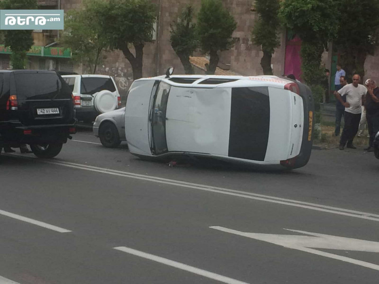 «Ռենո» մակնիշի տաքսի ծառայություն իրականացնող մեքենա հարվածել է երկու մեքենաների և արդյունքում կողաշրջվել: Վթարի հետևանքով որևէ մեկը չի տուժել:
