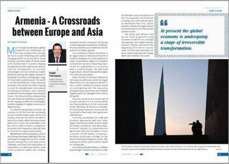 Գագիկ Ծառուկյանն իր հոդվածում շեշտում է Հայաստանի՝ Եվրոպայի և Ասիայի միջև խաչմերուկ հանդիսանալու հանգամանքը, ինչն էլ երկու աշխարհամասերի տեսանկյունից կարևոր է դարձնում ՀՀ-ում տնտեսական զարգացումը՝ որպես կապող օղակ և մոդել աշխարհի համար։