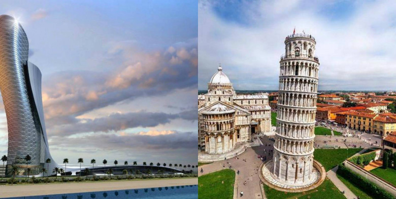 «Ընկնող» աշտարակների ռեկորդակիրը Աբու–Դաբիում գտնվող Capital Gate երկնաքերն է: Այն ունի 160 մետր բարձրություն և մտել է Գինեսի ռեկորդների գիրք, որպես ամենաթեք աշտարակ: Նրա թեքության անկյունը կազմում է 18օ: Ստացվում է, որ Պիզայի թեք աշտարակը իր 3,54օ թեքությամբ այս երկնաքերի մոտ ուղղակի «զգաստ կանգնած տղա» է: Ուղղակի հարցն այն է, որ Աբու–Դաբիի աշտարակը հենց սկզբից էլ այսպես է նախագծվել և կառուցվել, այն ժամանակի ընթացքում չի թեքվել: Թեքությունը աշտարակին տրվել է հետևյալ կերպ. մինչև 12–րդ հարկը հարկերը դրվել են միմյանց վրա ուղղահայաց, իսկ սկսած 12–րդ հարկից՝ 30–ից մինչև 140 սանտիմետր շեղումով, որն էլ հենց տալիս է թեքվածության տեսք: Ի դեպ, աշտարակը պատվիրատուի համար արժեցել է 2.2 միլիարդ դոլար: