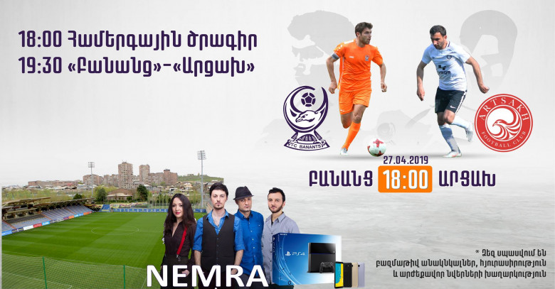 «Ապրիլի 27-ին, ժամը 18:00-ին տեղի կունենա վերանորոգված «Բանանց» մարզադաշտի վերաբացման հանդիսավոր արարողությունը։ «Բանանցը» Հայաստանի բարձրագույն խմբի առաջնության շրջանակներում կհյուրընկալի «Արցախին»։ Ձեզ համար ելույթ կունենա սիրված «Նեմրա» խումբը, կլինեն բազում անակնկալներ, արժեքավոր նվերների խաղարկություն և հյուրասիրություն։