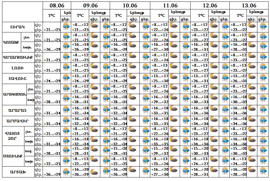 ՀԱՍԱՐԱԿՈՒԹՅՈՒՆՀանրապետության տարածքում` հունիսի 8-13-ը կեսօրից հետո շրջանների զգալի մասում սպասվում է կարճատև անձրև և ամպրոպ, առանձին վայրերում հնարավոր է կարկուտ: