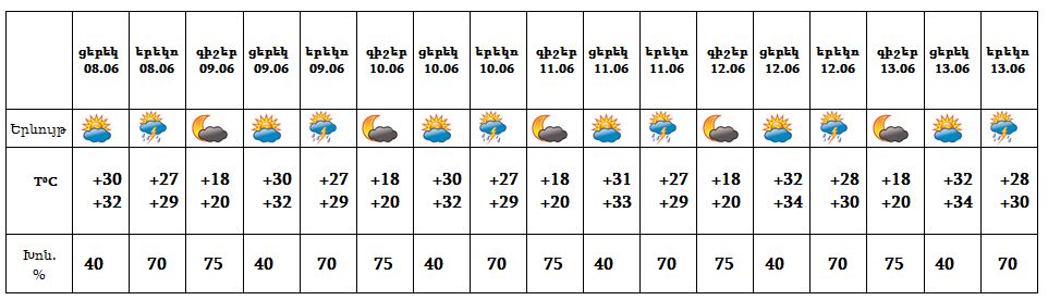 Երևան քաղաքում՝ հունիսի 8-13-ը երեկոյան ժամերին քաղաքի առանձին հատվածներում սպասվում է կարճատև անձրև և ամպրոպ, ամպրոպի ժամանակ՝ քամու ուժգնացում՝ 15-20 մ/վ արագությամբ: