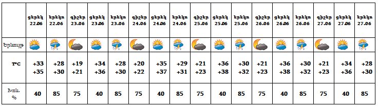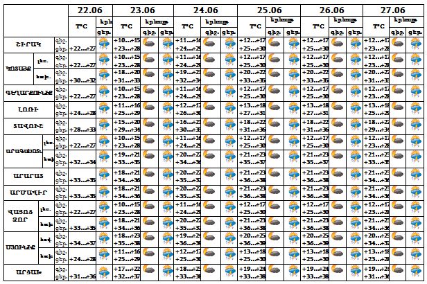 Երևան քաղաքում՝ հունիսի 22-27-ը` հատկապես գիշերը և կեսօրից հետո, քաղաքի առանձին հատվածներում սպասվում է կարճատև անձրև և ամպրոպ, ամպրոպի ժամանակ՝ նաև քամու ուժգնացում՝ մինչև 15-20 մ/վ արագությամբ: