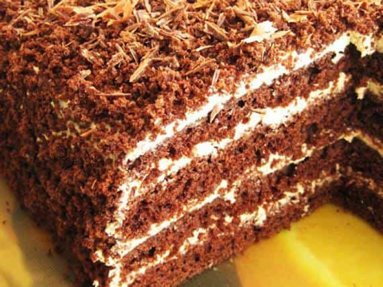 - Ստացված կրեմը քսում ենք տորթի ներքևի շերտի վրա և ծածկում երկրորդ շերտով: Նույնը կատարում ենք երկրորդ և երրորդ շերտերի հետ: Ծածկում ենք տորթը չորորդ շերտով, ապա ամբողջությամբ պատում ենք տորթը կրեմով: